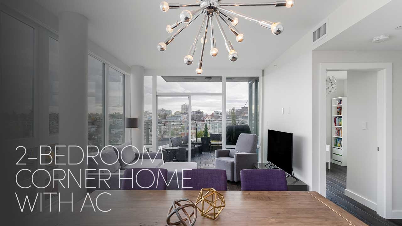 Podium-level, corner suite at the sought-after ‘Central’ building featuring expansive east and south views, AC, and a larger patio. This unique suite backs onto the enormously common area rooftop terrace, which is accessible two doors down the hall from this suite! This spacious home offers space for a full-size dining table, four stools at the island, a large master suite (w double sinks), and in-suite storage (den). Finishings include engineered hardwood, JennAir appliances, a gas cooktop, and floor-to-ceiling windows.